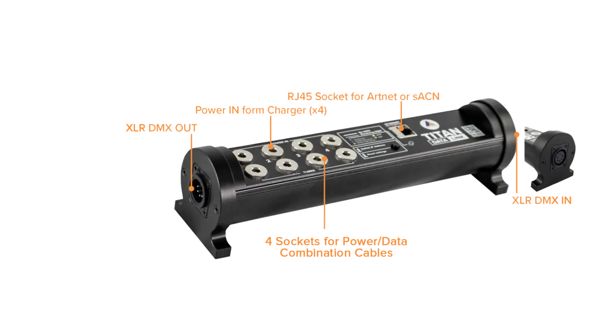 Eine der Funktionen des DataLinks ist es, ein zusätzliches DMX-Universum zu einer Titan PowerBox hinzuzufügen. Dazu wird das Gerät über Titan Strom-/Datenkabel mit der PowerBox verbunden, Daten angesteckt und bis zu 4 Tubes angeschlossen.
