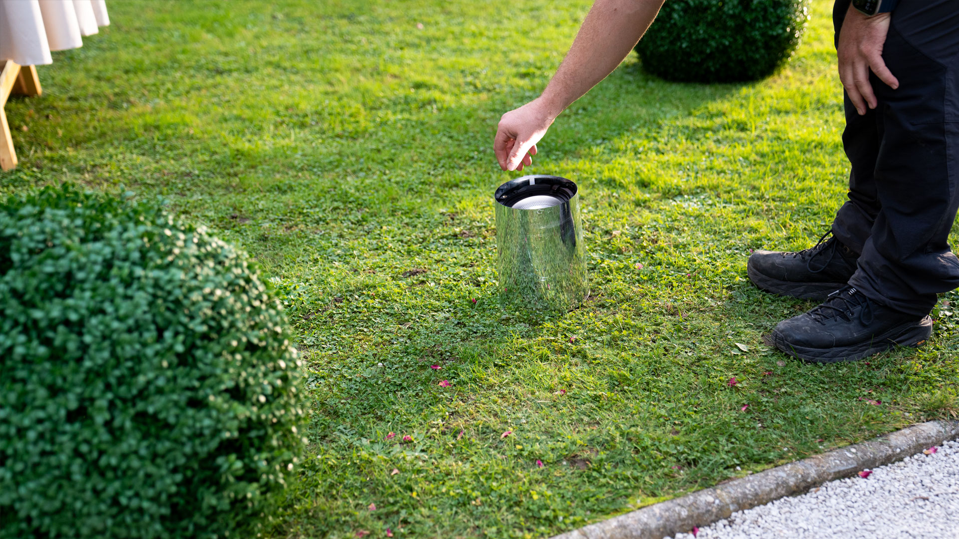 Die verspiegelte Abdeckung fügt den QuikSpot in die Umgebung ein, indem sie sich an die Farbe und das Muster des Bodens anpassen