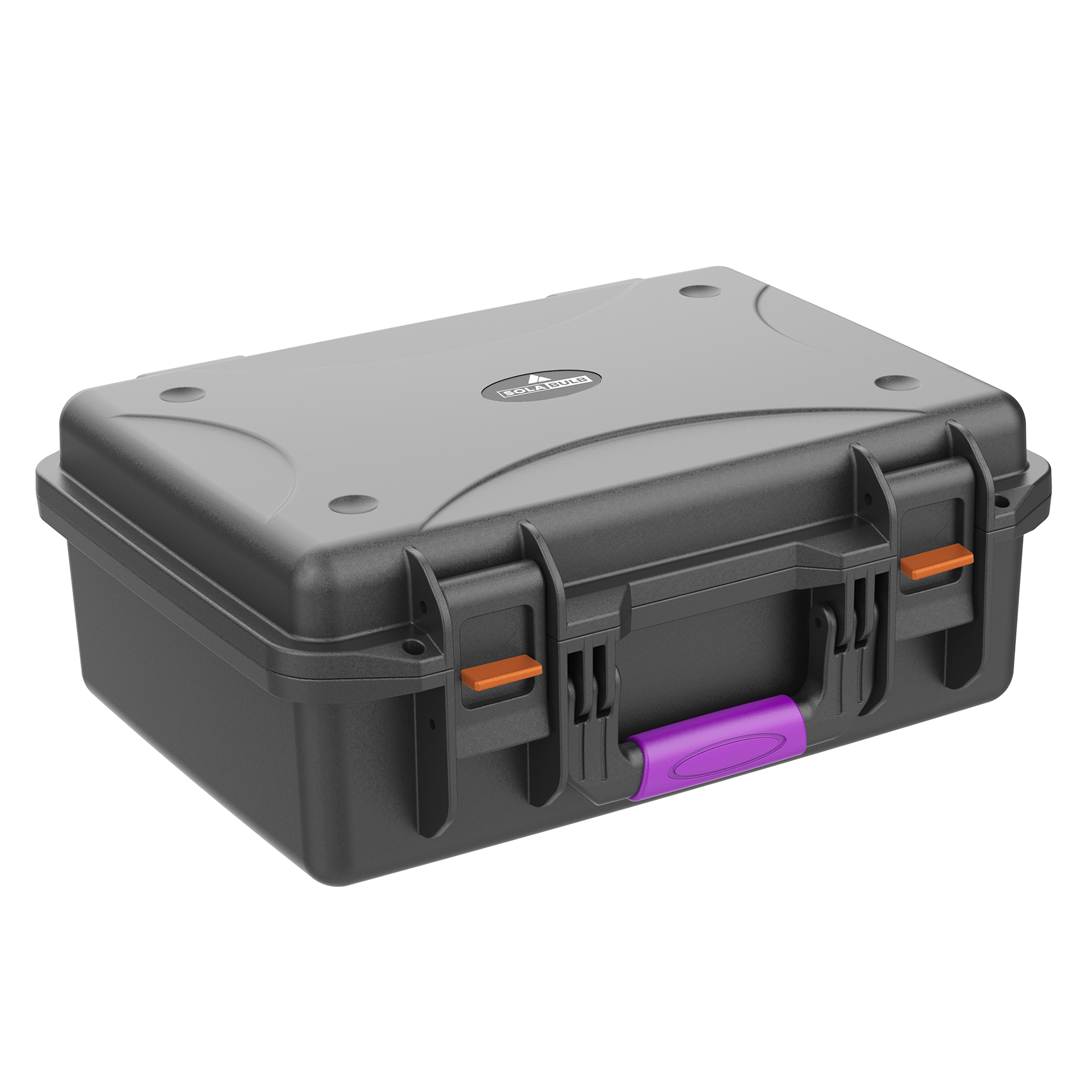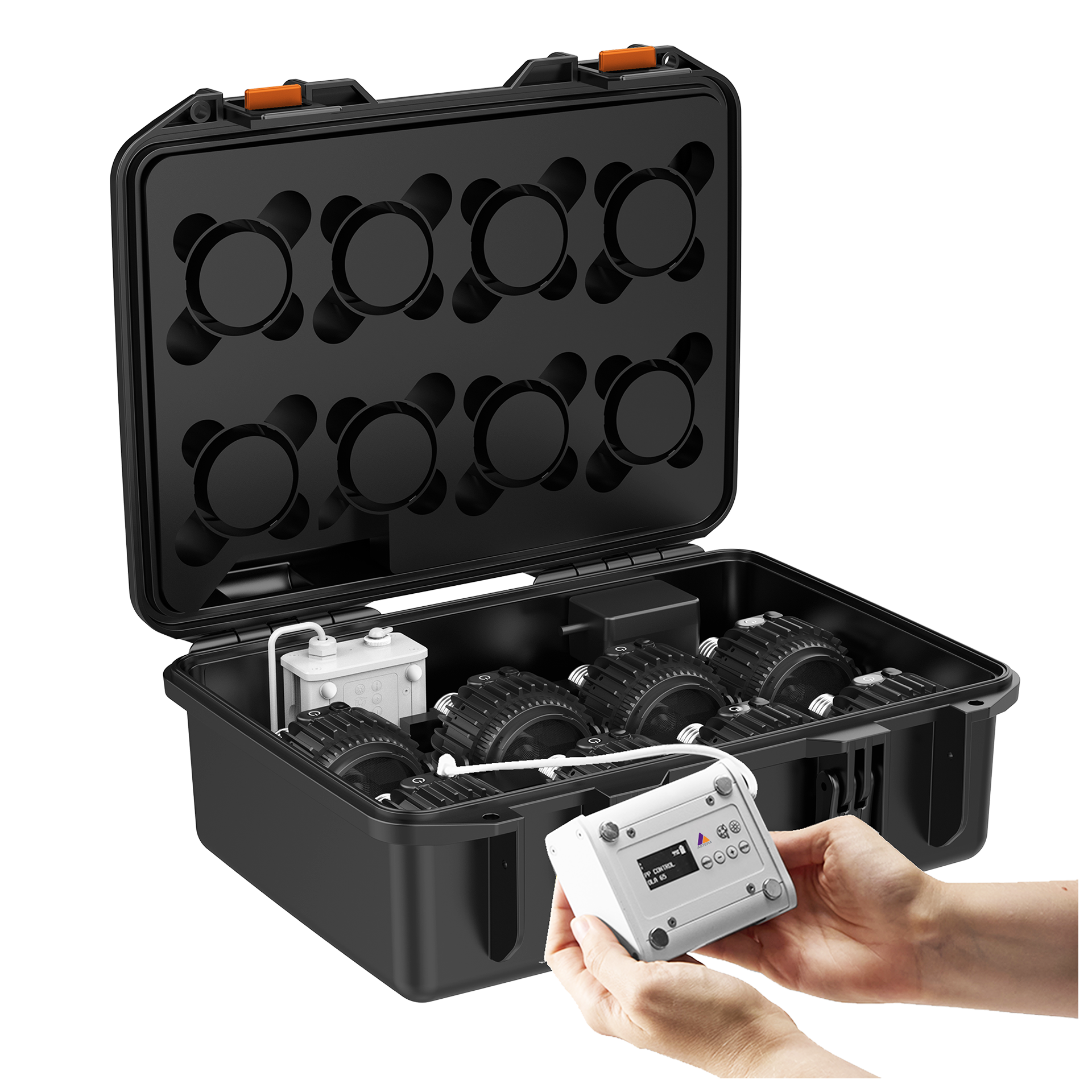 Set bestehend aus 8 SolaBulbs, 8 SolaSnoots und 1 PowerStation mit Ladegerät, aufbewahrt in einem robusten Schutzkoffer aus Kunststoff. Die PowerStation fungiert sowohl als externer Akku als auch als externes Display.