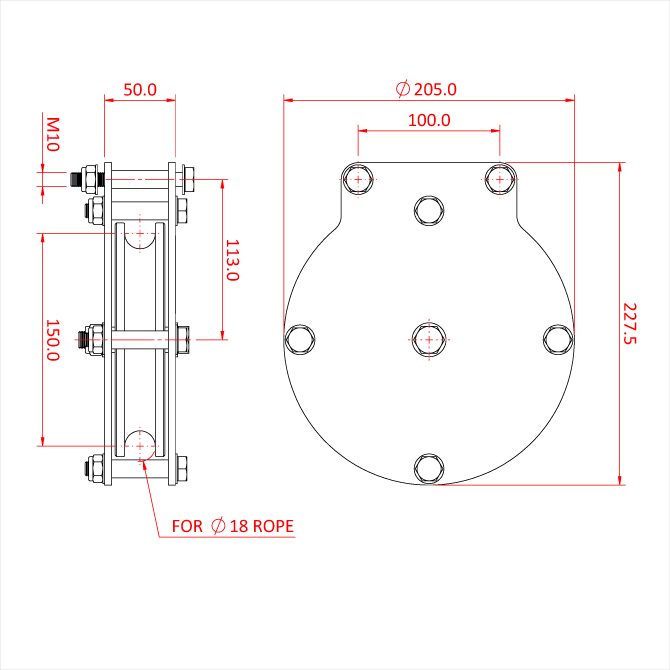 Komplett mit Kugellagern, profiliert für Faserseile und bereit zur Aufnahme einer unserer Befestigungsarten