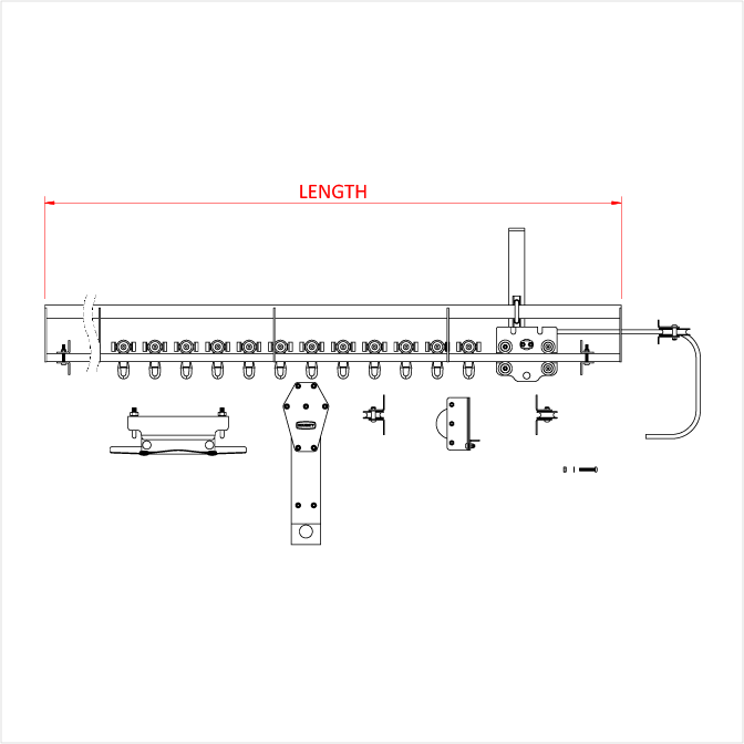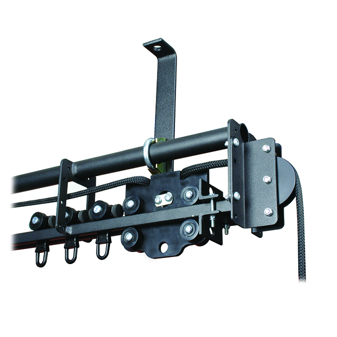 Ein typischer Satz besteht aus Schienen, verstellbaren Halterungen, einem Schrauben- und Mutternsatz, einem Hauptläufer, Läufern, Rollen, Zugseil, Seilhalterungen und einer beschwerten Handrolle.