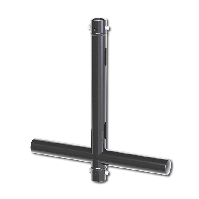 Ein grosses, modular aufgebautes T-Stück aus Aluminium mit Durchgangsverbinder, das häufig zur Erstellung eines Leiterrahmens für eine grosse Scheinwerfergruppe verwendet wird.