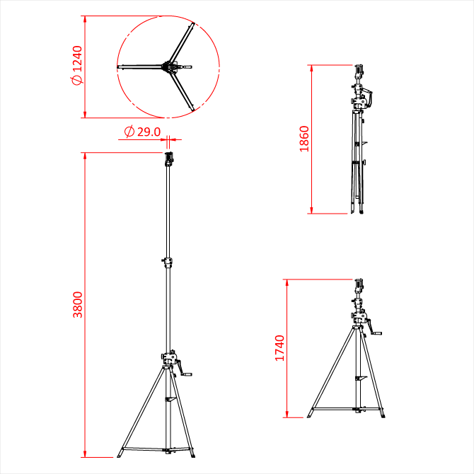 Zu den Sicherheitsmerkmalen gehören ein doppeltes Kabelhebesystem, eine selbstbremsende Winde und eine einzigartige sekundäre automatische Verriegelung. Diese Stativehaben eine maximale Höhe von 3,8 m und eine Tragfähigkeit von 30 kg.