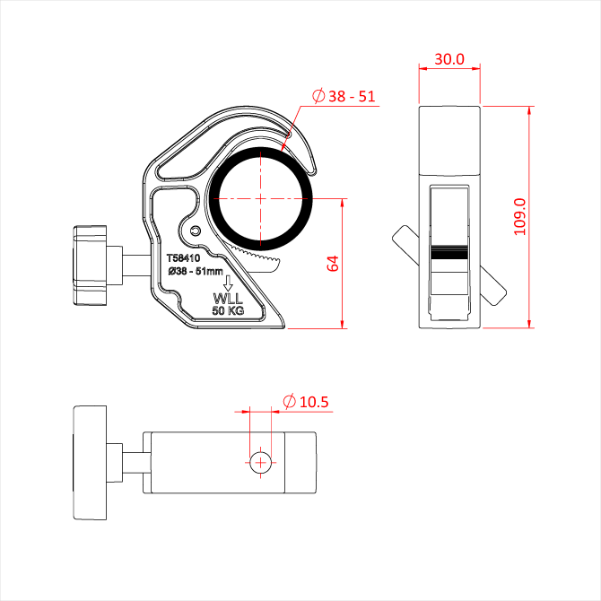 Er hat eine zulässige Arbeitslast (WLL) von 50 kg und ist 30 mm breit. Geschlitzt, um eine M10-Mutter oder Schraubenkopf sicher zu halten. Ideal für den Einsatz mit leichten Scheinwerfern an Traversensystemen, da sie das Rohr nicht beschädig. Die perfekte Alternative zu herkömmlichen Stahlhakenklemmen. Erhältlich in pulverbeschichtetem Schwarz.