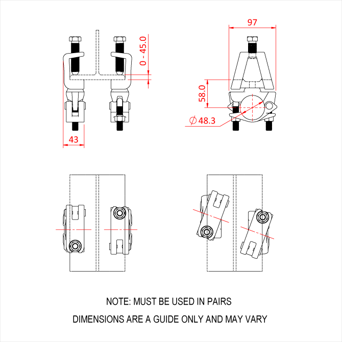 Verzinkte Stahl-Hochleistungsklemmen, paarweise erhältlich, zur Befestigung von 48-mm-Rohren an einem Träger mit einer Drehbarkeit von 360 Grad.