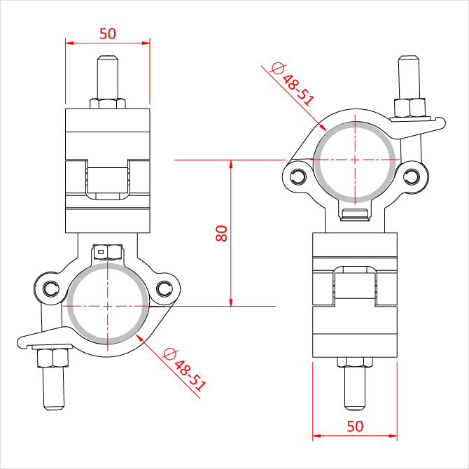 Zwei hochfester, stranggepresster Aluminium-Rohrschellen, die Rücken an Rücken parallel verriegelt werden und für Rohre mit einem Durchmesser von 48 bis 51 mm geeignet sind.