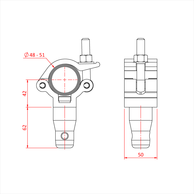 Eine grosse Auswahl an Aluminium-Clamps, ab Werk mit halben konischen Verbindern ausgestattet. Dienen zur Aufhängung von Modular Rigging an Traversen oder Rohren.