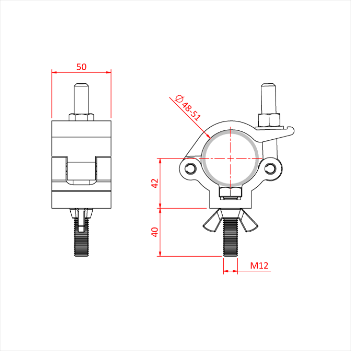 Eine hochfeste, stranggepresste Rohrschelle, die für Rohre mit einem Durchmesser von 48 mm bis 51 mm geeignet ist. Sie hat eine Tragfähigkeit von 500 kg und ist 50 mm breit.