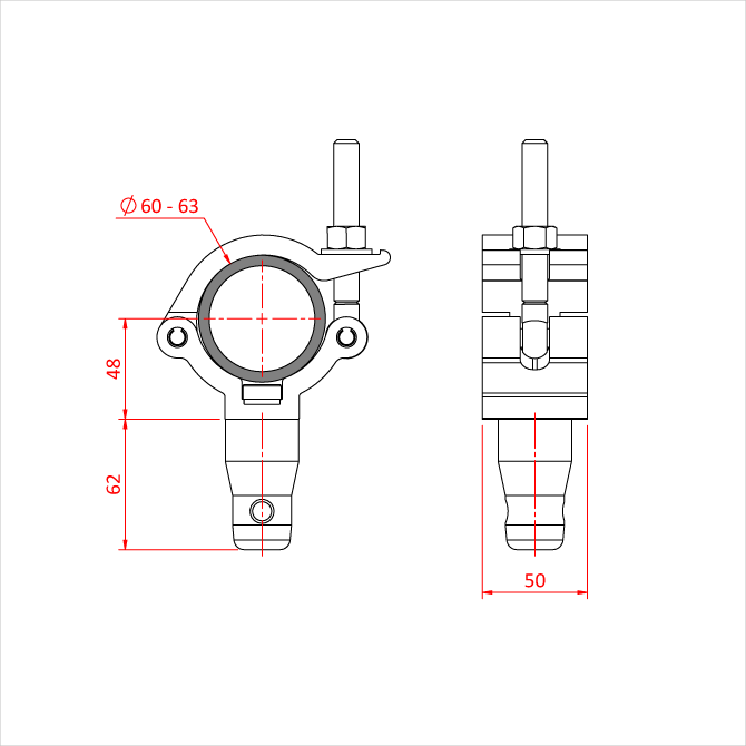 Eine grosse Auswahl an Aluminium-Clamps, ab Werk mit halben konischen Verbindern ausgestattet. Dienen zur Aufhängung von Modular Rigging an Traversen oder Rohren.