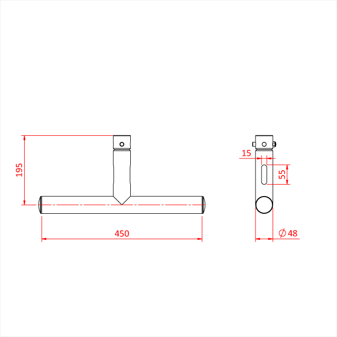 Ein kleines modulares T-Stück aus Aluminium, das häufig in Kombination mit Verlängerungen für das Abhängen von Scheinwerfern verwendet wird. Eine Aussparung für ein Sicherungsseil ist vorhanden.