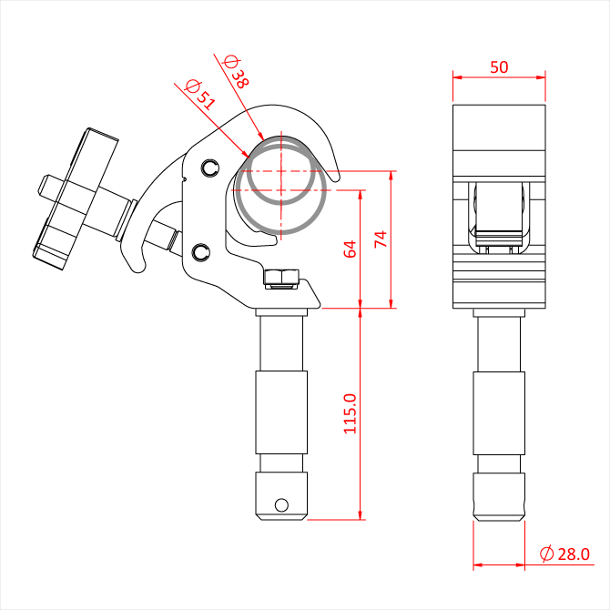 Ein hochfester Montagehaken aus stranggepresstem Aluminium, der für Rohre mit einem Durchmesser von 38 mm bis 51 mm geeignet ist.