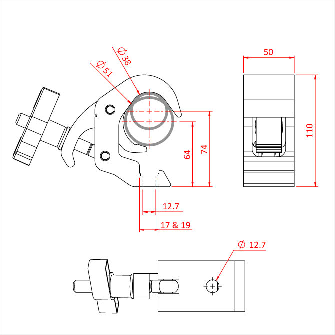 Ein hochfester Montagehaken aus stranggepresstem Aluminium, der für Rohre mit einem Durchmesser von 38 mm bis 51 mm geeignet ist. Er hat eine Tragfähigkeit von 250 kg und ist 50 mm breit. Geschlitzt, um eine M10- oder M12-Mutter oder einen Schraubenkopf unverlierbar zu halten. Ideal für die Aufhängung grosser Moving Heads an Traversen, da er die Seile nicht beschädigt. Erhältlich in poliertem Silber oder pulverbeschichtetem Schwarz.