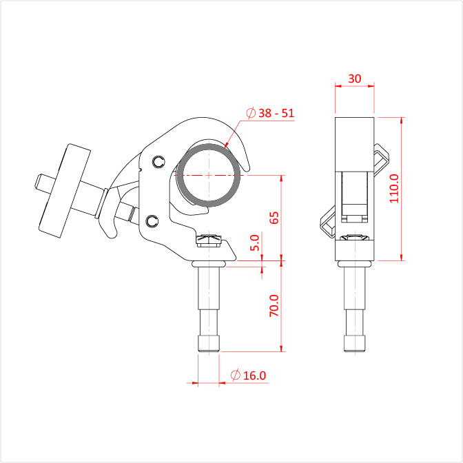 Ein hochfester Montagehaken aus stranggepresstem Aluminium, der für Rohre mit einem Durchmesser von 38 mm bis 51 mm geeignet ist.