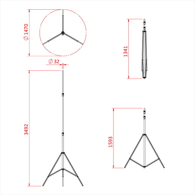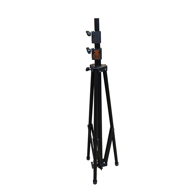 Ein hochwertiges Stativ mit einer maximalen Höhe von 3,5 m und einer Tragfähigkeit von 40 kg. Mit integrierten Federdämpfern, doppelten Beinstreben und Verriegelungsknöpfen aus Aluminiumdruckguss.