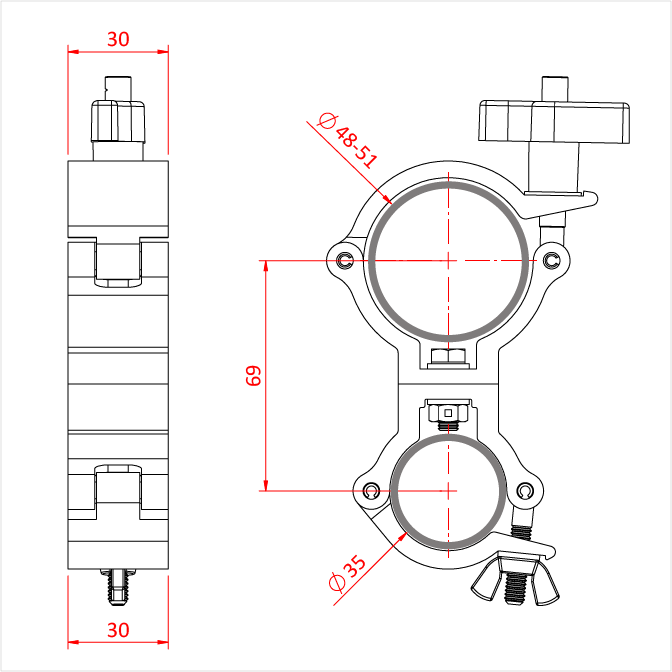 Zwei hochfester, stranggepresster Aluminium-Rohrschellen, die sich auf der einen Seite für Rohre mit einem Durchmesser von 48 mm bis 51 mm und auf der anderen Seite für Rohre mit einem Durchmesser von 25 mm, 32 mm, 35 mm oder 38 mm eignen.