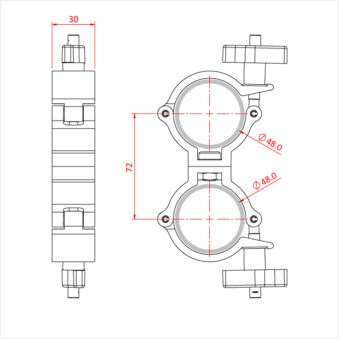 Zwei hochfester, stranggepresster Aluminium-Half Coupler, die sich um 360° drehen lassen und für Rohre mit einem Durchmesser von 48 bis 51 mm und einer Breite von 30 mm geeignet sind.