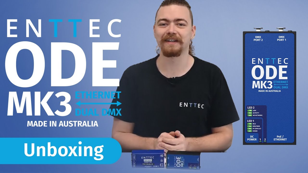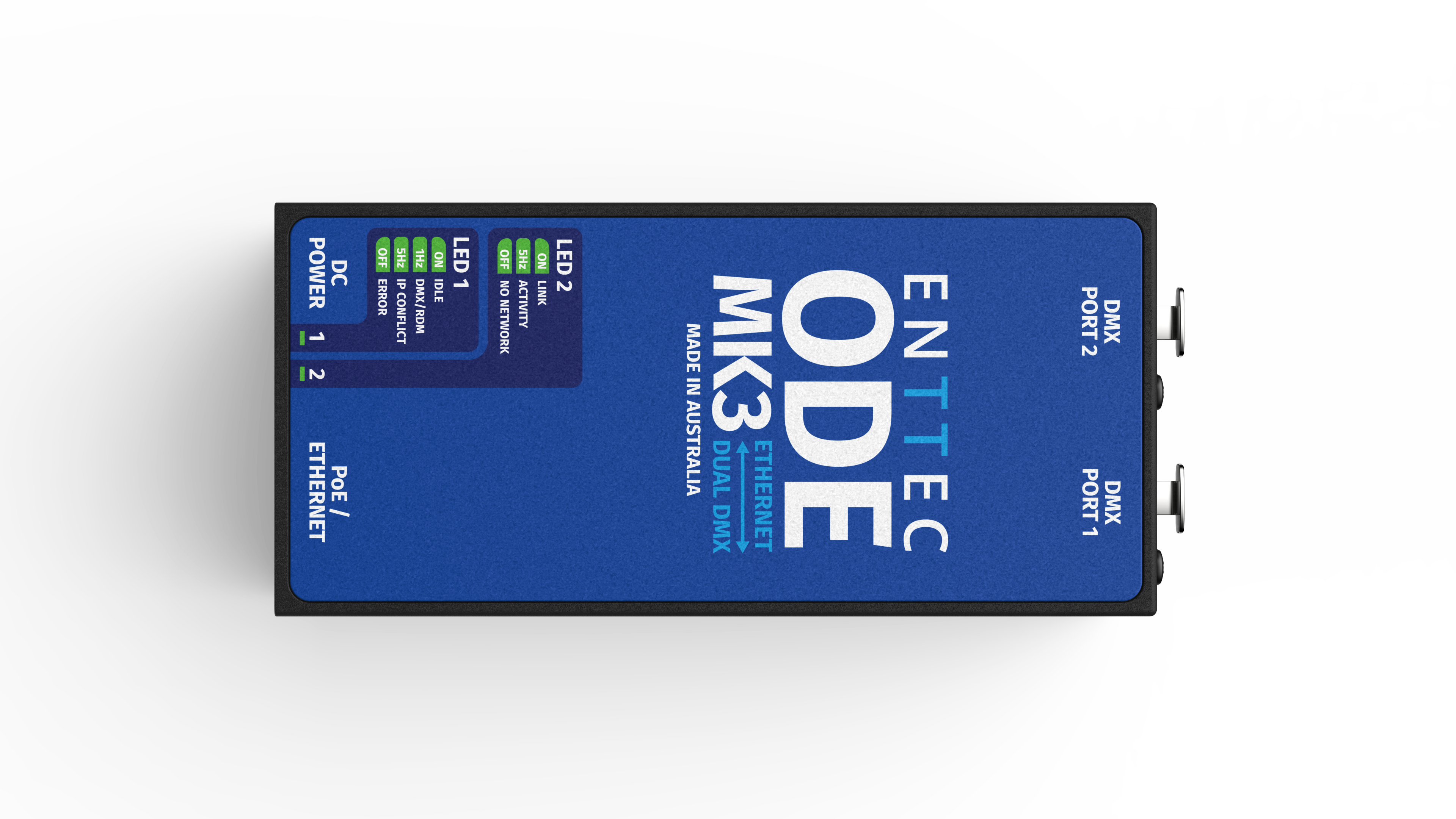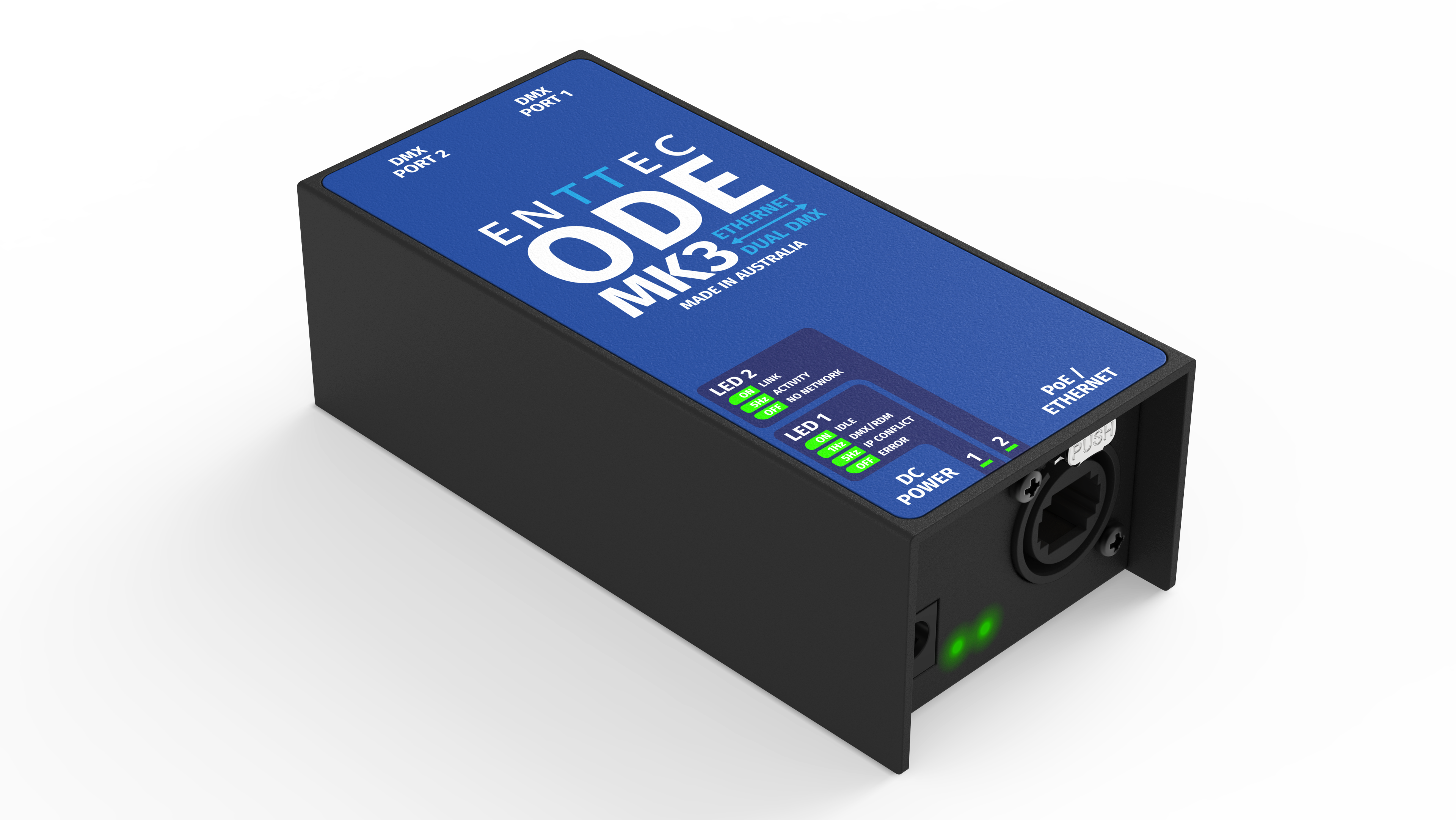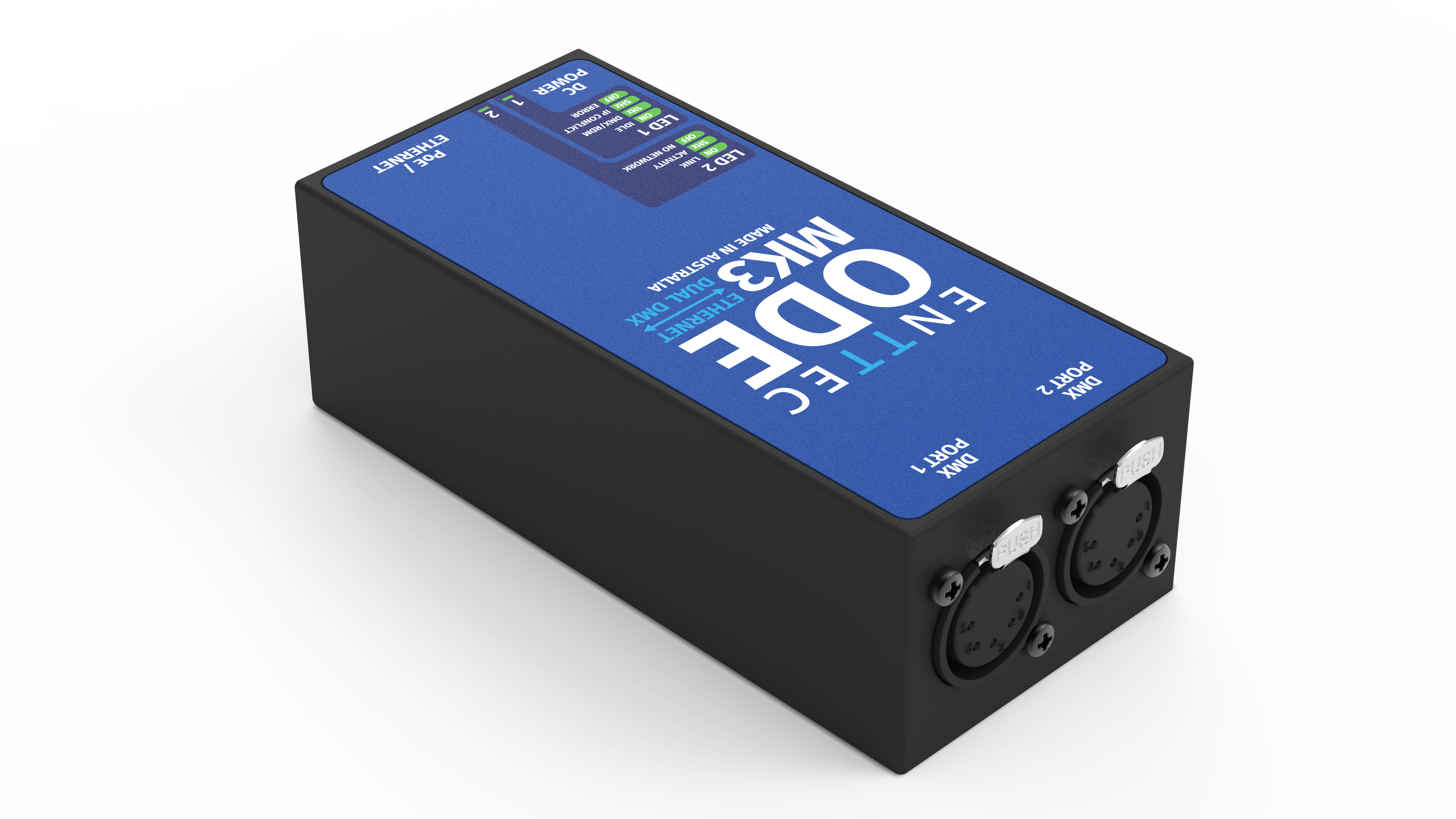 Der ODE MK3 ist ein robuster, zuverlässiger, installationsfähiger Ethernet zu DMX Konverter, der entwickelt wurde, um DMX Geräte mit Ihrer Ethernet Netzwerkinfrastruktur zu verbinden.