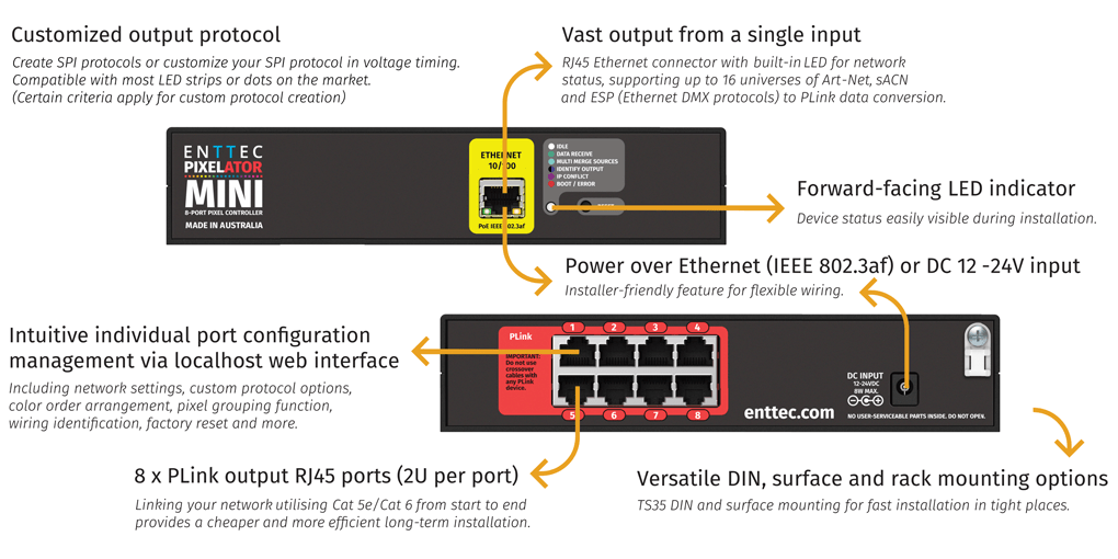 Der Pixelator Mini dient als zentraler Controller des PLink Steuerungssystems von ENTTEC. Die von ihm erzeugten PLink-Daten können über eine Standard CAT6 Verkabelung bis zu 300 m weit gesendet werden, um sie an die kompakten Stromversorgungsmodule und LED Dimmer von ENTTEC anzuschliessen.