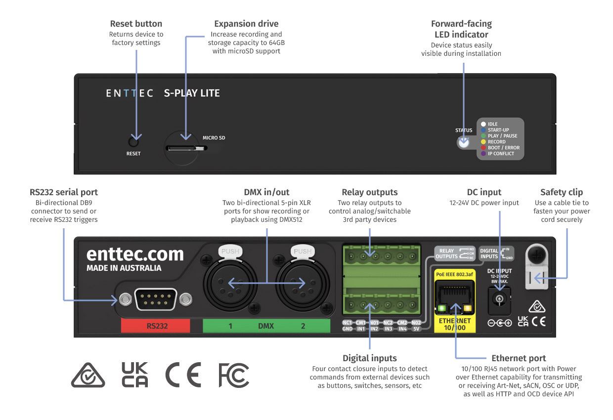 - 2 x bidirektionale 5-polige XLR DMX Ports zur Aufnahme oder Wiedergabe von Shows.