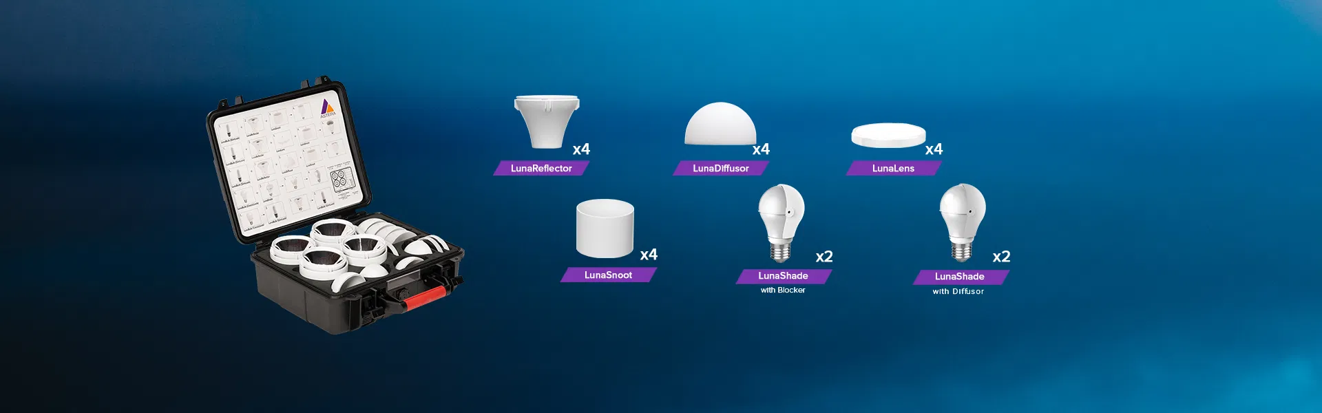 4x LunaReflector, 4x LunaLens, 4x LunaDiffuser, 4x LunaSnoot, 2x LunaShades avec Diffusion & Blocker