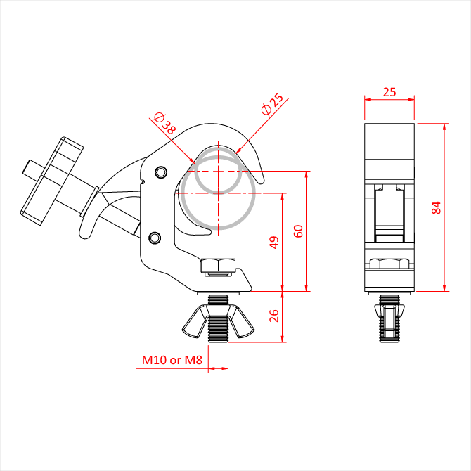 Un crochet de montage très résistant en aluminium extrudé qui convient aux tubes de 25 mm à 38 mm de diamètre. Il a une capacité de charge de 40 kg et une largeur de 25 mm. Il est fendu pour maintenir de manière imperdable un écrou M8 ou M10 ou une tête de vis et est livré avec une vis M10 X 35 et un écrou à oreilles. Idéal pour les petites traverses, il n'endommage pas les câbles. Disponible en argent poli ou en noir revêtu par poudre.