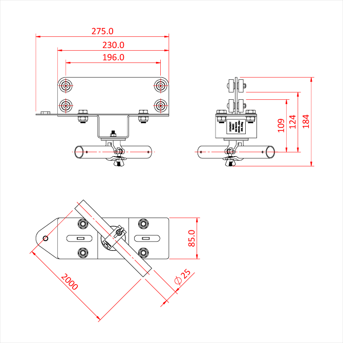 Un collier de tube de 25 mm en aluminium monté sur un support en acier doux fixé à un wagon Six Track non freiné.