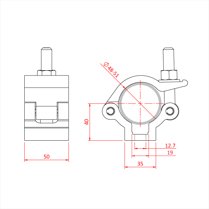 Un clamp très résistant en aluminium extrudé, adapté aux tubes de 48 mm à 51 mm de diamètre.