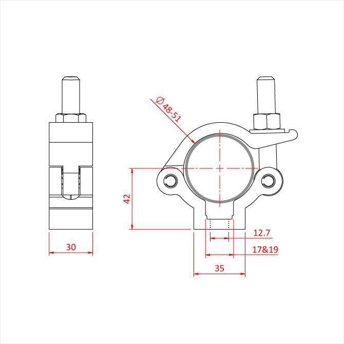 Un clamp très résistant en aluminium extrudé qui convient pour les tubes d'un diamètre de 48 mm à 51 mm.