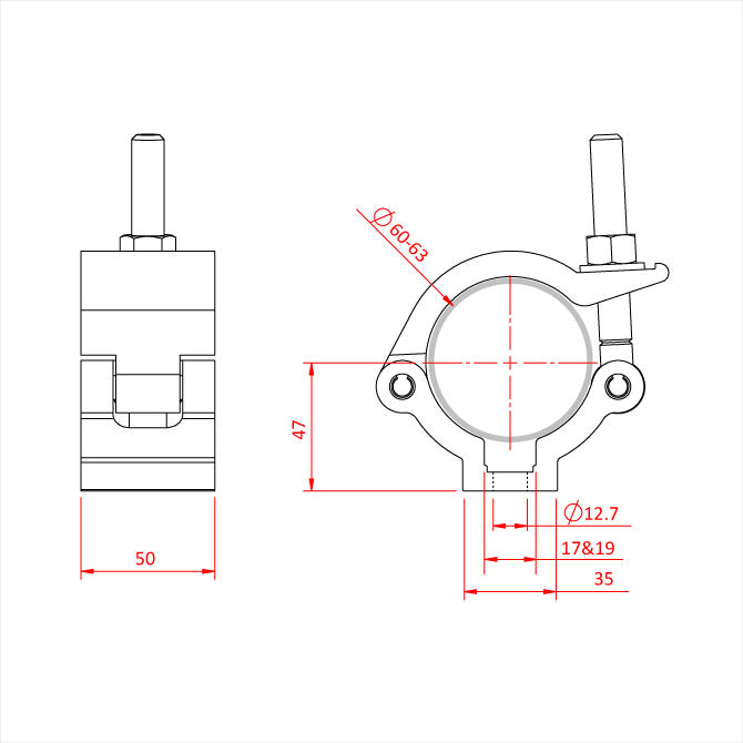 Un collier de serrage en aluminium extrudé, très résistant et fin, qui convient aux tubes de 60 mm à 63 mm de diamètre.