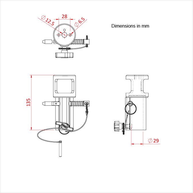 Le récepteur 3 points a une charge admissible (SWL) de 100 kg et convient aux spigots de 28 mm (1-1/8 pouce) selon les normes européennes ou DIN.