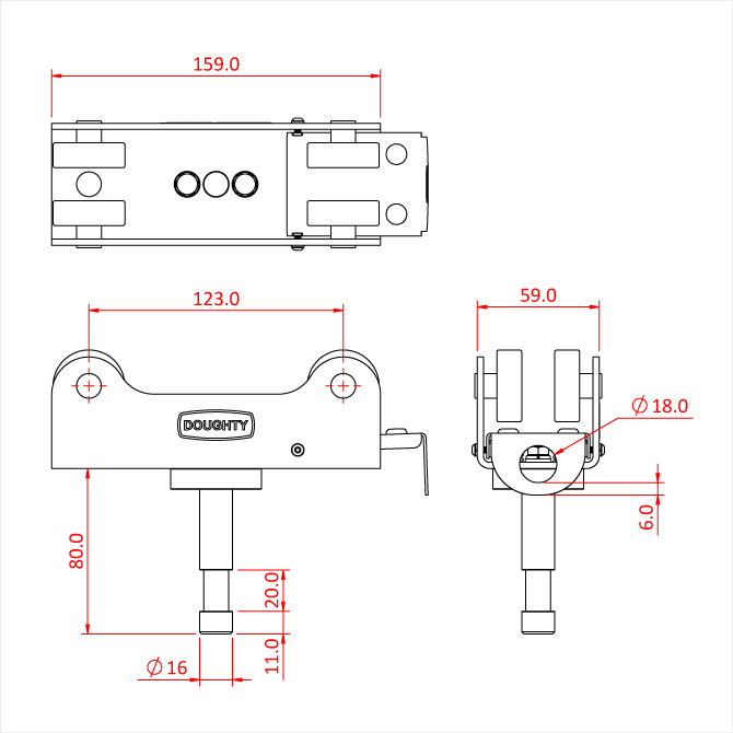 Doughty Engineering Studio Rail 80 Chariot à 4 roues, complet avec tourillon 5/8" (frein)