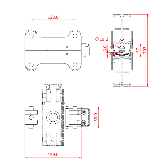 Un chariot pivotant double en acier doux permet de monter un rail mobile en travers de deux rails fixes. Ce rail peut être pivoté à n'importe quel angle que sa longueur permet. Idéal pour les grilles de studio TV mobiles.