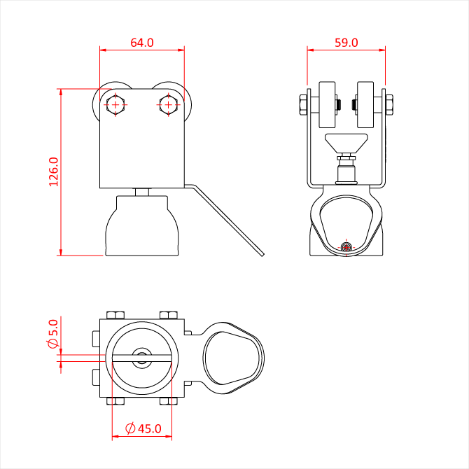 Un frein à rideau à quatre roues en acier doux avec auget intégré, équipé d'un auget de commande en aluminium usiné avec précision et de roues à roulements à billes.