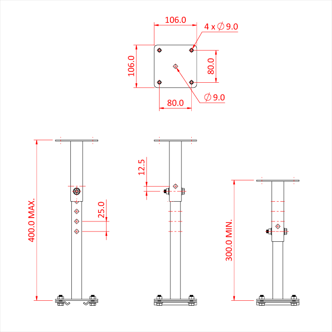 Réglable de 300 à 400 mm de long par incréments de 25 mm.