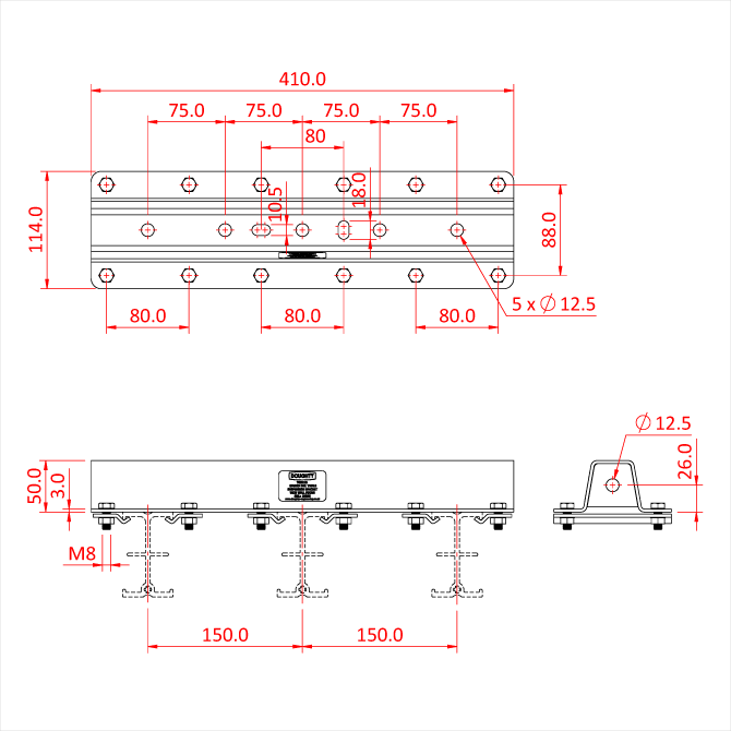 Une série de supports en acier doux pour suspendre un, deux ou trois rails en un seul point avec un espacement standard Studio Rail de 150 mm. Ce support est livré avec des pinces pour rails et offre en standard la possibilité d'utiliser une fixation latérale, ce qui permet de stabiliser les grilles ou les rails de délimitation avec des fixations murales.