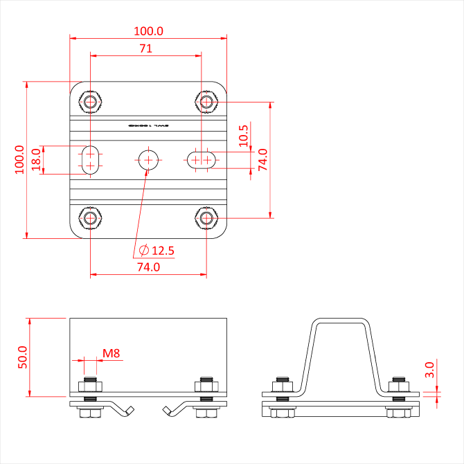 Le support de plafond est livré avec deux pinces de rail et accepte soit une tige filetée M10 soit une tige filetée M12.