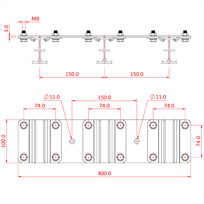 Un support en acier non allié qui permet de placer deux ou trois rails parallèlement les uns aux autres, à une distance de 150 mm, pour correspondre aux points centraux d'une paire de courbes.