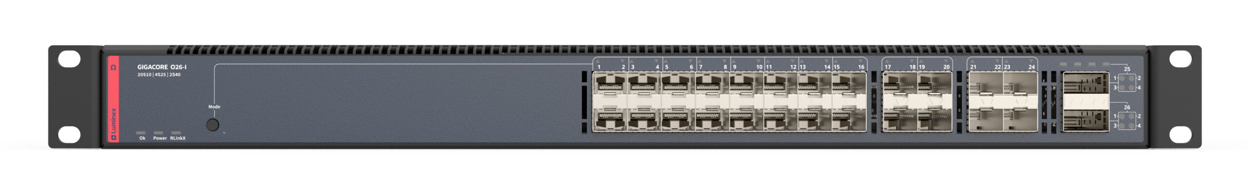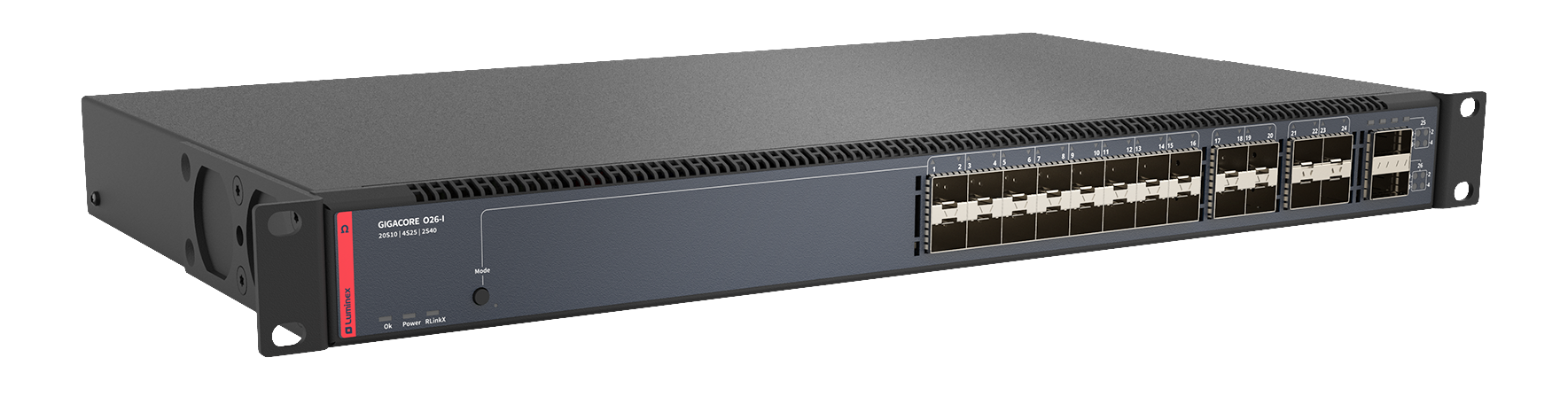 Le GigaCore O26-I est unSwitch 40 Gigabit Ethernet pour l'intégration AV, l'installation et le touring, qui supporte nativement les protocoles AV les plus modernes. Il constitue la solution idéale en tant que backbone à large bande passante pour les réseaux AV professionnels à topologie en étoile ou en machine.