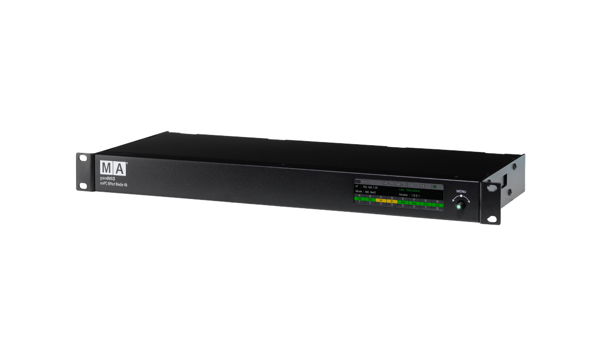 Der grandMA3 onPC 8Port Node 4K schaltet in Verbindung mit grandMA3 onPC 4.096 Parameter frei und stellt auf der Rückseite acht DMX-Ausgänge bereit. Verbaut in einem 19"/1HE Gehäuse ist dieser Node der leistungsstärkste Netzwerk zu DMX Konverter der grandMA3 onPC Reihe und ist bestens für Touring- und Festinstallationen geeignet.